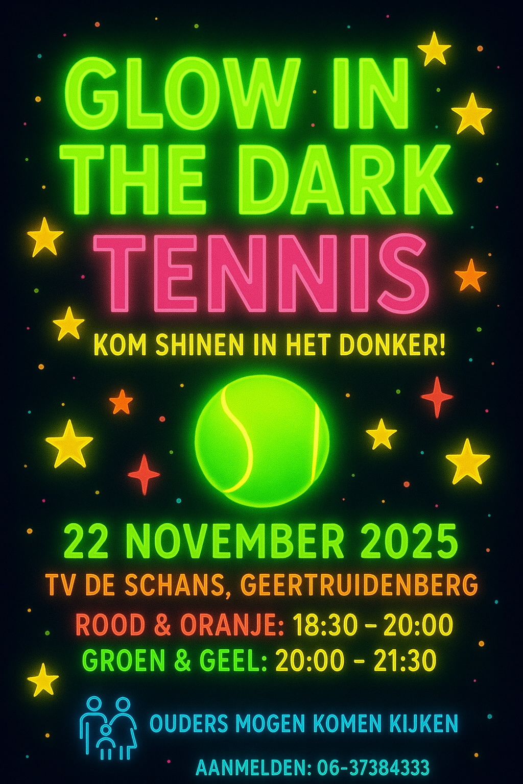 Op zaterdag 22 november gaan we stralen op de baan bij TV De Schans in Geertruidenberg! Trek witte of felle kleding aan en versier jezelf met neon schmink of accessoires â hoe meer je opvalt, hoe cooler het wordt! đđĄ