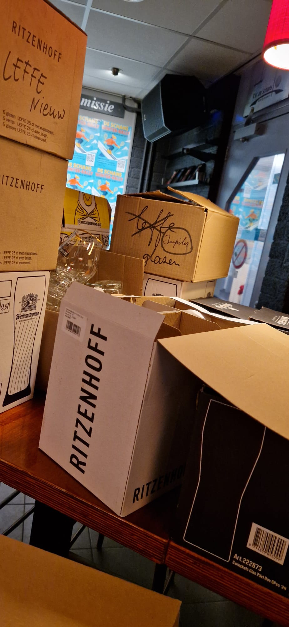 De oude glazen staan bij het afhangbord — neem gerust mee!